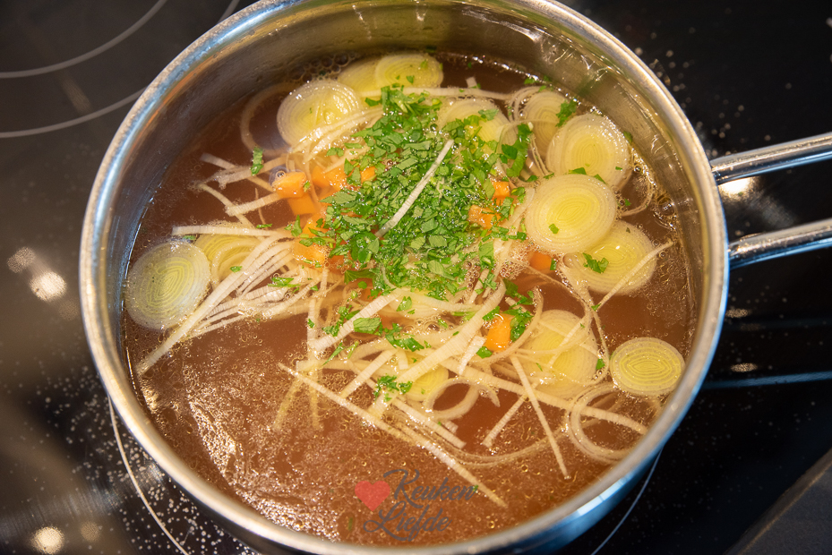 Voor dit recept kun je zowel runderbouillon als groentebouillon gebruiken. De bouillon kun je zelf maken (zie linkjes bij ingrediënten), of je maakt hem heel eenvoudig met een bouillonblokje. Daar is helemaal niks mis mee. Met wat verse groenten en eisterren erin tover je de eenvoudigste bouillon om in een heerlijk, kerstig soepje. Als je de bouillon zelf wilt maken (het is wel de moeite waard) dan kun je dit al een dag, of zelfs paar dagen van tevoren al doen. Wil je hem langer van tevoren maken, dan kun je hem ook prima invriezen.