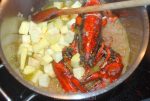 Zet de kreeft aan in olie, voeg de sjalot toe. Zweet de groenten aan in olie, doe ze bij de kreeft. Vul aan met gevogeltefond tot alles net onder staat, breng aan de kook, schuim af, laat 30 minuten trekken.
