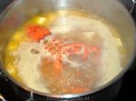 Haal de kreeft uit het kookvocht en laat nu 15 minuten ‘rusten’ in de andere pan met court bouillon van 70ºC. Haal dan uit de pan en laat hem iets afkoelen totdat je hem vast kunt houden.