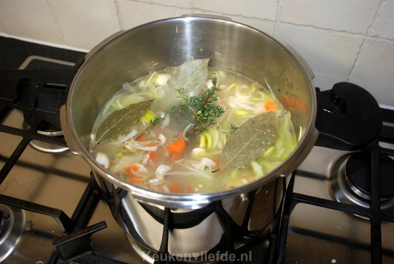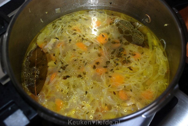 Voeg de tijm, laurierblaadjes en 2 liter koud water toe.