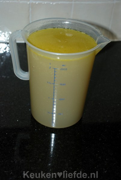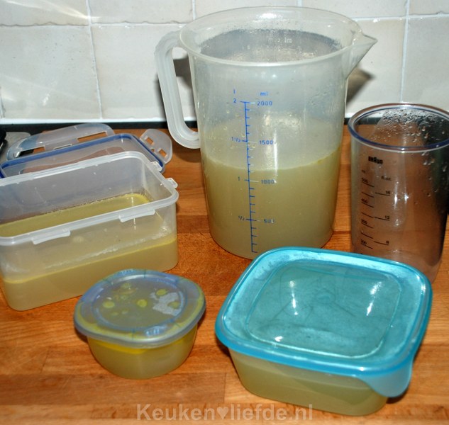 Giet de bouillon door een met twee lagen nat gemaakte kaasdoek (of theedoek) bedekte zeef en zet hem tot gebruik in de koelkast of vriezer.