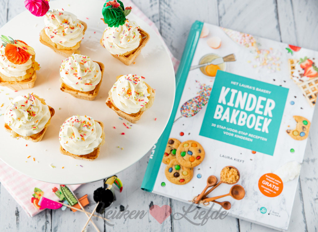 Hoe leuk zijn deze ijsjes cupcakes! Ze komen uit het ‘Kinderbakboek’ van Laura Kieft. Als je van bakken houdt ken je Laura ongetwijfeld van haar zoete bakblog Laura’s Bakery. Ik snuffel regelmatig even rond op haar website om me te verlekkeren aan de prachtige foto’s en leuke recepten.