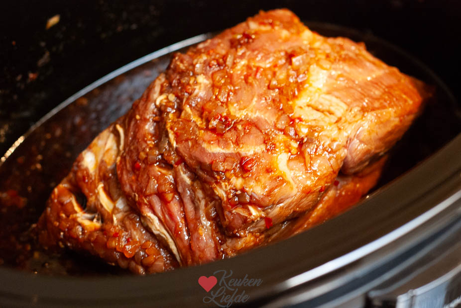 Na een gesprek met eigenaresse Anke stond ik te trappelen om aan de slag te gaan met mijn Andrew James. Anke — zelf fervent slowcooker fan — gaf mij een beproefd recept mee voor Indo pulled pork. Een recept van Eetspiratie dat Anke inmiddels al veelvuldig en met groot succes gemaakt heeft. Ik heb het recept hier en daar iets aangepast naar eigen smaak. Het leek mij het perfecte gerecht om mijn slowcooker de vuurdoop mee te geven.