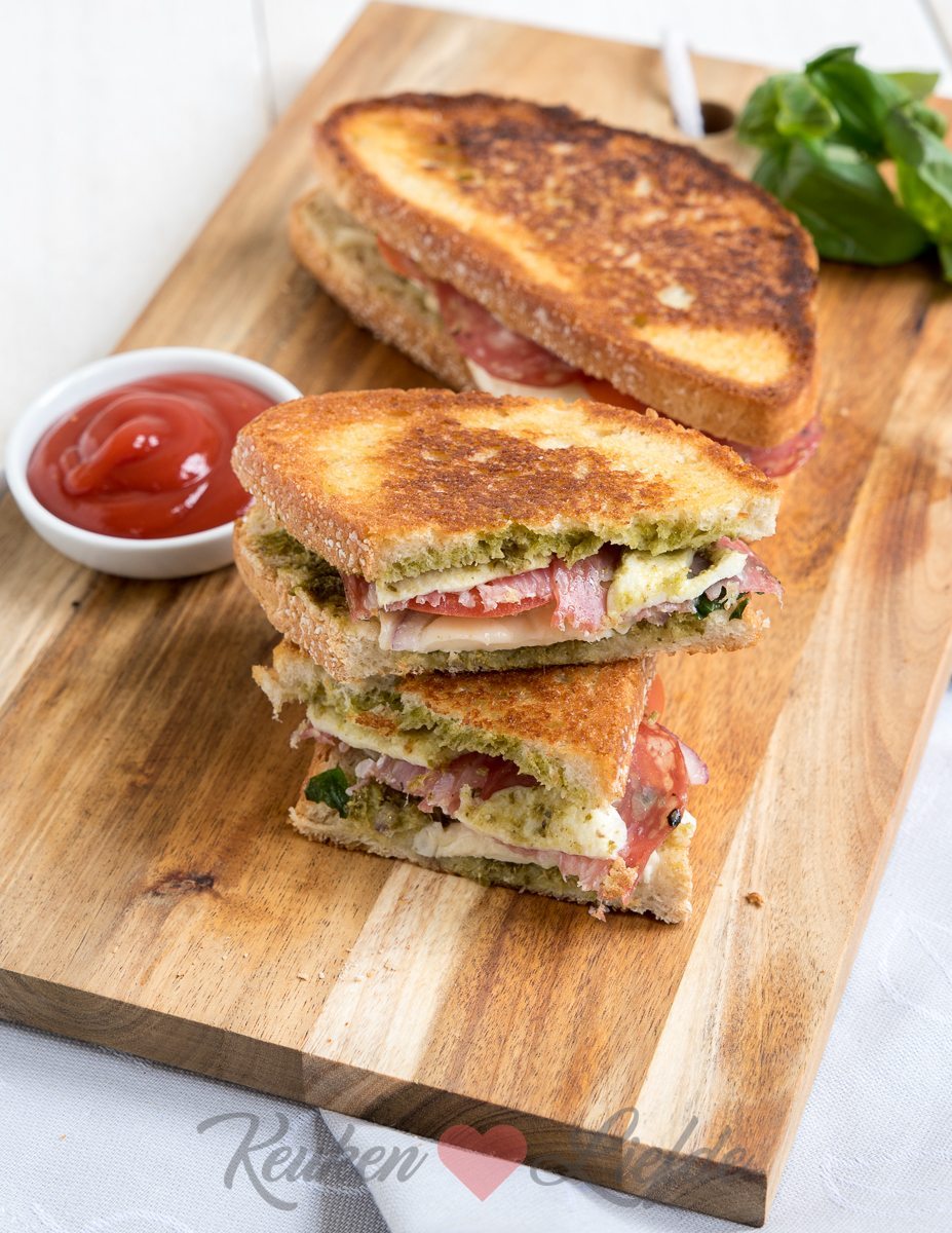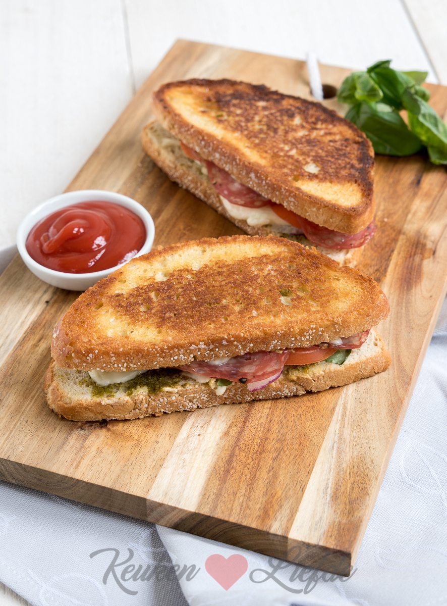 Zo blij met een man die lekker kan koken! Hoewel ik doordeweeks meestal in de keuken sta, is de keuken in het weekend vaak het domein van Johan. Dit keer maakt hij een lekkere lunch, namelijk een Italiaanse pantosti’s belegd met pesto, tomaat, mozzarella en spianata romana. Een toppertje kan ik je zeggen!
