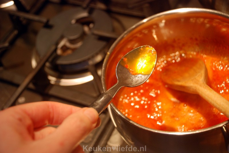 In de – voornamelijk Amerikaanse – recepten die ik op internet vond, wordt onder andere pectinepoeder gebruikt. Pectine wordt gewonnen uit appel-, citrus- of suikerbietenpulp en vormt bij verhitting met suiker een gelei. Het wordt ook gebruikt om jam te maken. De meeste vruchten waar je jam van maakt, zoals aardbeien, kersen, pruimen en in dit recept rode pepers, bevatten van nature geen of te weinig pectine om een stevige jam te krijgen. Hoewel je pectinepoeder bij sommige webshops kunt bestellen, besloot ik om dit recept te maken met geleisuiker, waar al pectine aan toegevoegd is. Omdat jalapeño pepers bij ons moeilijk te verkrijgen zijn, heb ik deze vervangen door rode Spaanse pepers.