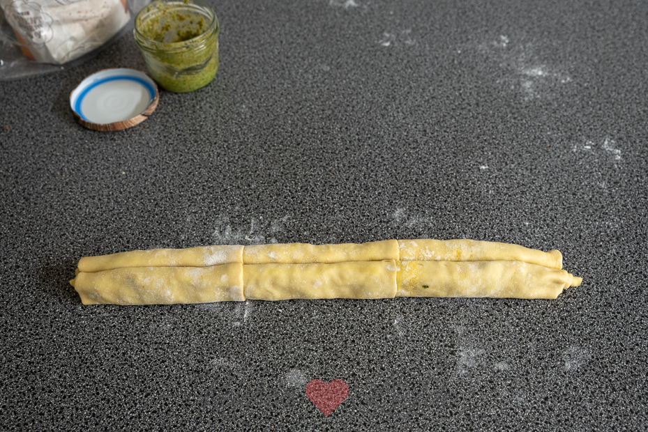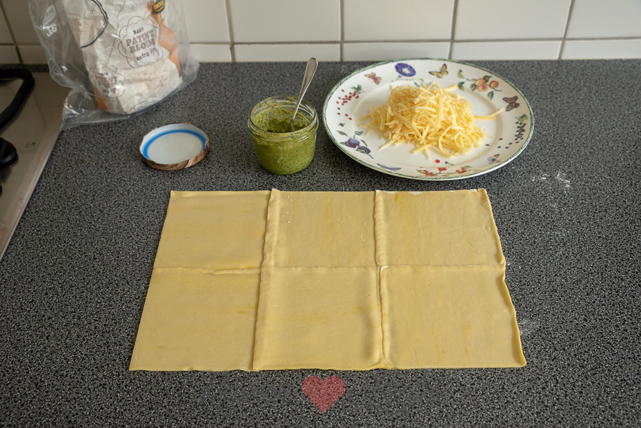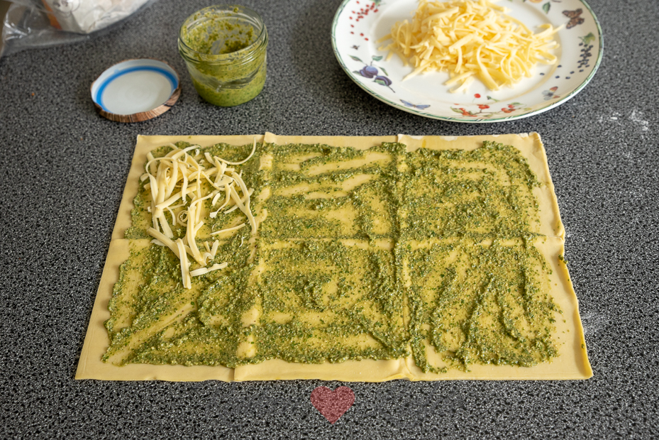 Rol het bladerdeeg uit tot een langwerpige lap. Besmeer met pesto en bestrooi met de geraspte kaas. Rol vanaf beide lange kanten zo strak mogelijk op tot halverwege, zodat beide rollen strak tegen elkaar aanliggen.
