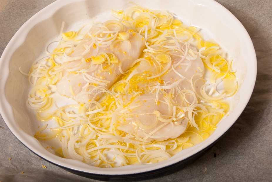 Verwarm de oven voor op 70 graden. Snijd het witte gedeelte van de bosui in flinterdunne ringen. Leg de kabeljauw in een licht ingevette ovenschaal en bestrooi licht met gemalen zeezout. Strooi de bosui — je hoeft niet alles te gebruiken, doe het op gevoel — en citroenrasp eroverheen. Besprenkel met olijfolie en bak 23 minuten in de oven. De kabeljauw is dan nét gaar en fluweelzacht.