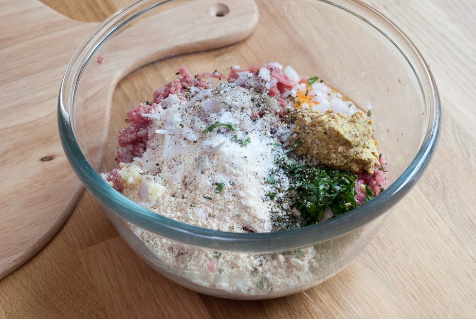 Voeg de knoflook, sjalot, fijngehakte kruiden, verkruimelde crackers, mosterd en het ei toe aan het gehakt en breng goed op smaak met zout en peper. Kneed met je handen door elkaar. Leg het gehakt op een stuk bakpapier en druk met je handen uit tot een rechthoek.