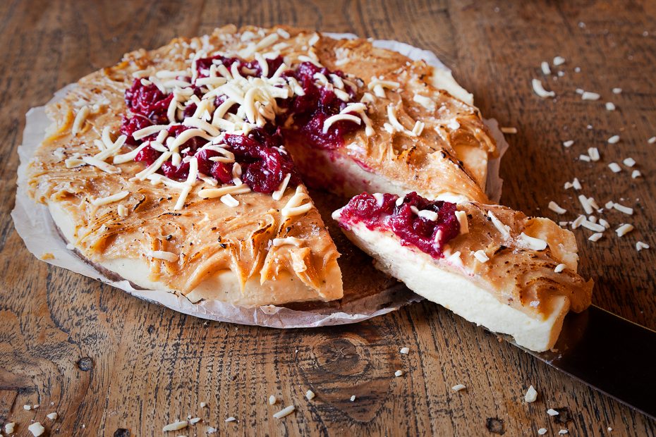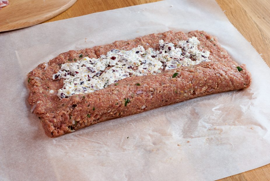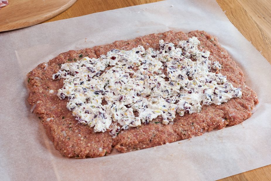 Roer de pistache en cranberry’s door de roomkaas en verdeel dit over het gehakt. Als dit lastig gaat — de roomkaas is lastig uit te smeren door de gehakte cranberry’s en pistache —, kun je eventueel het roomkaasmengsel eerst tussen vershoudfolie uitrollen tot een rechthoekige lap en dan op het gehaktbrood leggen. Rol het gehakt op. Duw de uiteinden van het gehaktbrood met je handen dicht. Verdeel het spek over de bovenkant en leg het gehaktbrood op bakpapier op een bakplaat. Bak het gehaktbrood circa 30 minuten, of totdat de bovenkant begint te kleuren en de binnenkant gaar is.