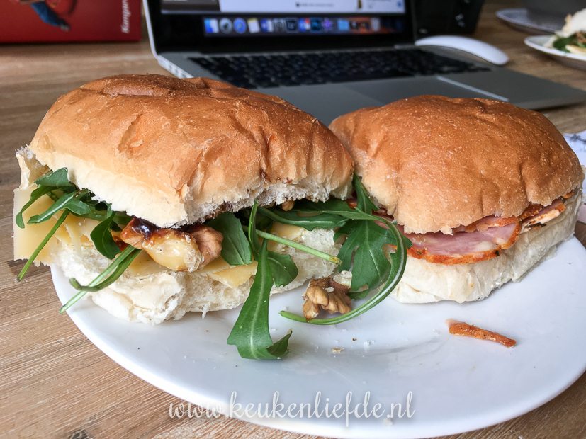 Johan maakt als lunch deze lekkere broodjes met oude kaas, appelstroop, walnoten en rucola en grillworst met kaas.