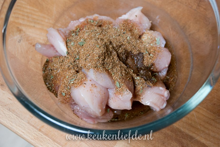 Snijd de kipfilet in middelgrote stukken en meng in een kom met de kebab kruidenmix en zonnebloemolie. Roer goed door en dek af met vershoudfolie. Zet minimaal 2 tot maximaal 24 uur in de koelkast om te marineren.