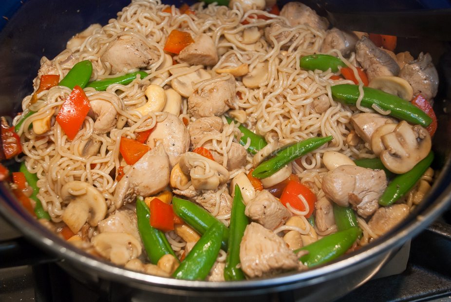 Voeg indien nodig een extra scheutje olie toe aan de hapjespan en bak de paprika en champignons op hoog vuur, totdat ze licht beginnen te kleuren. Voeg dan de sugar snaps, cashewnoten, kippenbouillon, oester- en sojasaus toe. Breng aan de kook en laat kort even doorpruttelen, totdat alle ingrediënten door en door warm zijn en de kip gaar is.