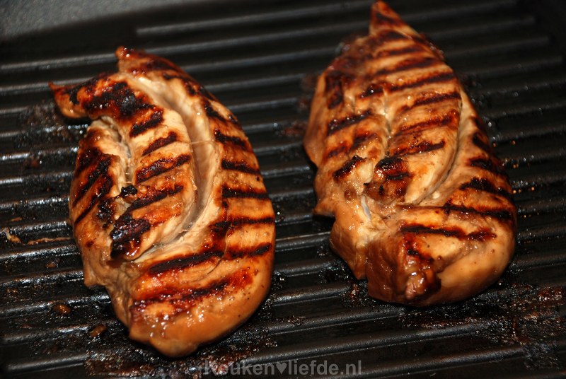 Verhit de grillpan en grill de kipfilet aan beide kanten totdat hij gaar is en mooie grillstrepen heeft.