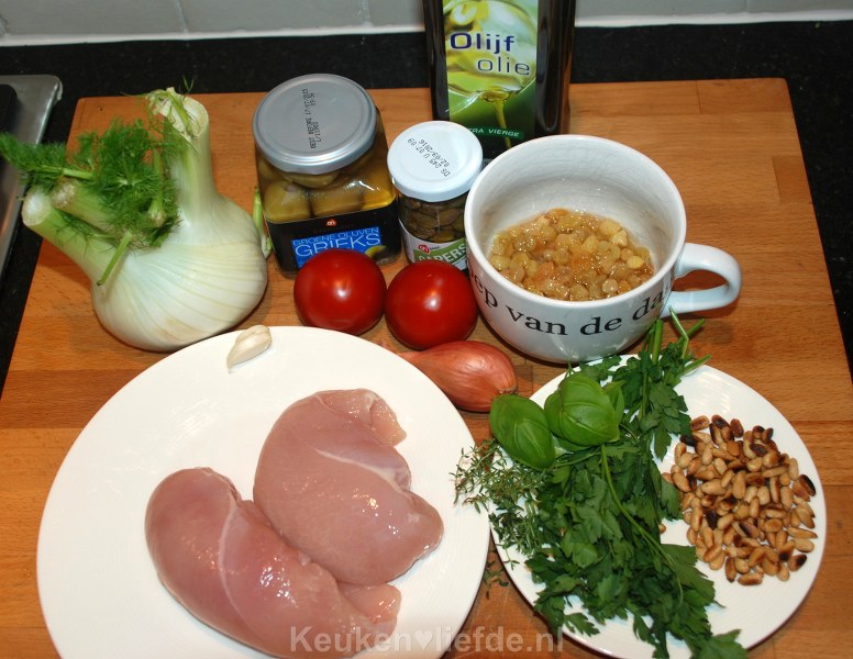 Deze kip uit de oven met venkel is echt the bomb! Het gerecht der gerechten, crème de la crème, het neusje van de zalm. Serieus. Dit was één van de allereerste recepten die ik poste op keukenliefde en behoort nog steeds tot mijn meest favoriete recepten. De frisse topping met venkel, rozijnen, kappertjes en olijven geeft een geweldige smaaksensatie aan de kip. Zoet, zuur, zout en bitter, alles is in perfecte balans met elkaar. Dit gerecht is mijn redding als ik zin heb in iets lichts, of als ik iemand wil verwennen met het ultieme gerecht.
