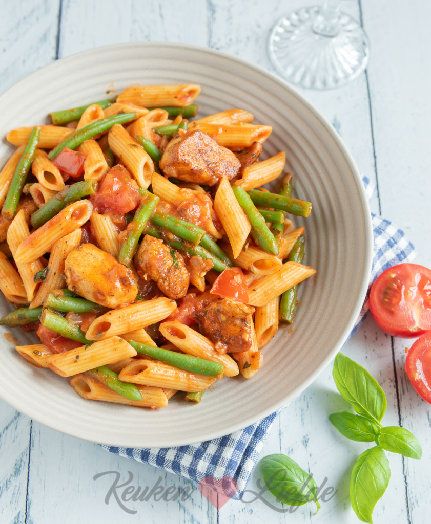 Voor dit gerecht liet ik me inspireren door een bekende pakjesfabrikant. Vroeger gebruikte ik regelmatig een pakje of zakje om snel een maaltijd op tafel te toveren als ik weinig inspiratie had, maar tegenwoordig niet meer. Het is namelijk net zo makkelijk en veel lekkerder om deze gerechten zelf te maken. Deze kipfilet Toscane is daar een mooi voorbeeld van. Een heerlijk pastagerecht met gekruide kip en smakelijke tomatensaus met sperziebonen en tomaatjes. Heel simpel om te maken en zelfgemaakt het allerlekkerst!