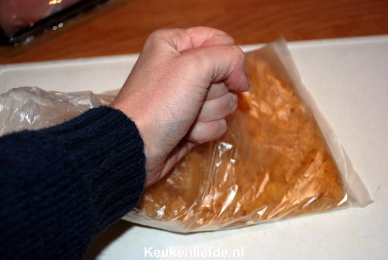 Doe de cornflakes in een boterhamzakje (een enkel zakje gaat snel kapot dus gebruik 2 zakjes in elkaar) en sla de cornflakes met je vuist in kleine stukjes.