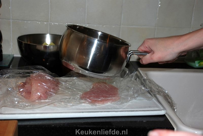 Strooi de cornflakes samen met de geraspte Parmezaanse kaas op een bord en meng dit door elkaar. Zet nog twee andere borden klaar met bloem en losgeklopt ei. Breng het losgeklopte ei op smaak met zout en peper. Snijd de kipfilets over de lengte doormidden. Leg ze tussen 2 lagen vershoudfolie en sla ze voorzichtig plat met een speciale vleeshamer of de onderkant van een koekenpan.