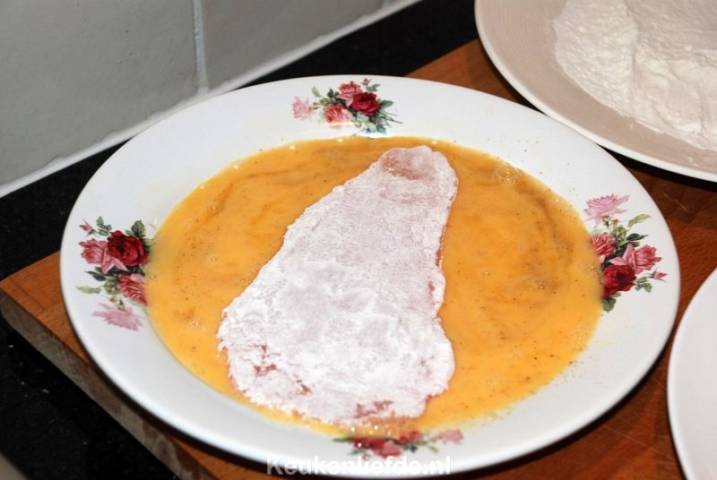 Pas op dat je geen gaten in de filets sla. Wentel de kipfilet nu eerst door de bloem, dan het ei en tot slot de paneer.