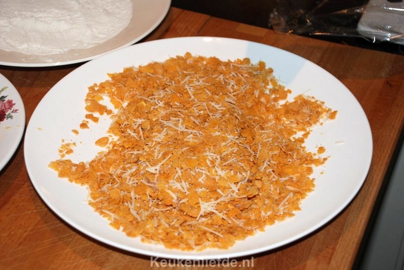 Kipschnitzel in krokant Parmezaanjasje