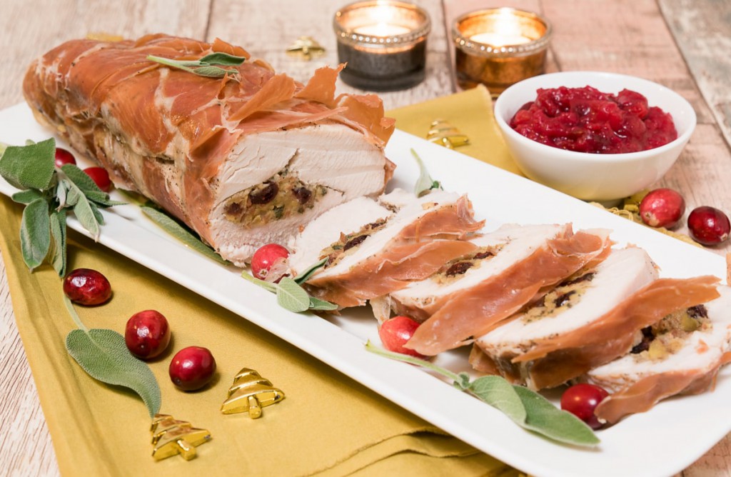 Gevulde kalkoenrollade met ham, cranberry en salie