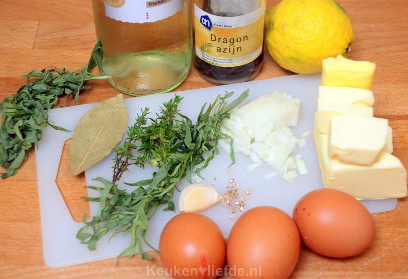 Klop de eidooiers – in een vuurvaste kom, boven een pan met warm water – samen met de warme castrique tot een lichtbleke en romige massa. Voeg dan beetje bij beetje de geklaarde roomboter toe, terwijl je flink blijft kloppen. Voeg net zoveel boter toe, totdat je een gladde en romige saus hebt. Proef en breng de saus verder op smaak met zout, peper en citroensap. Roer tot slot de gehakte dragon door de saus en serveer de saus direct.
