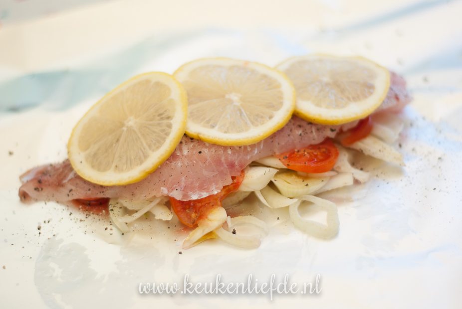 Verdeel de venkel en tomaat over vier vellen aluminiumfolie. Druppel er wat olijfolie overheen en bestrooi met zout en peper. Leg de visfilets erbovenop. Bestrooi met zout en peper. Bedek de vis met de citroenplakjes en druppel er nog wat olijfolie overheen. Vouw de pakketjes goed dicht en leg ze circa 8 minuten op de barbecue (grilltijd is mede afhankelijk van de dikte van de vis).