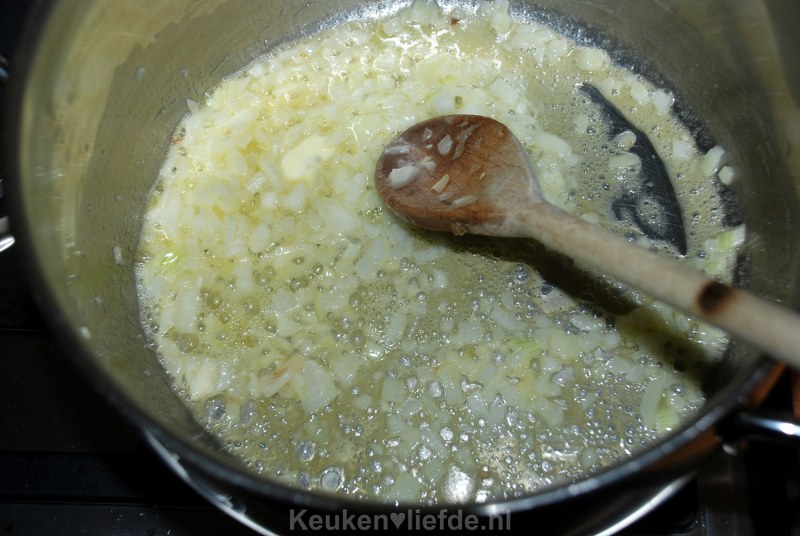 Smelt in een grote pan 50 gram boter en fruit hierin de overige ui zachtjes aan.