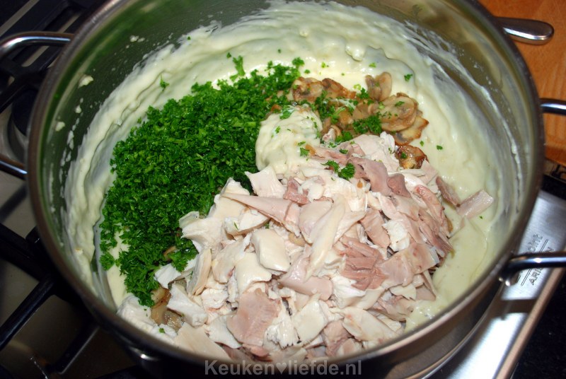 Laat de saus op laag vuur 4-5 minuten zachtjes pruttelen. Breng goed op smaak met zout en peper en roer de kip, champignons en peterselie erdoor.