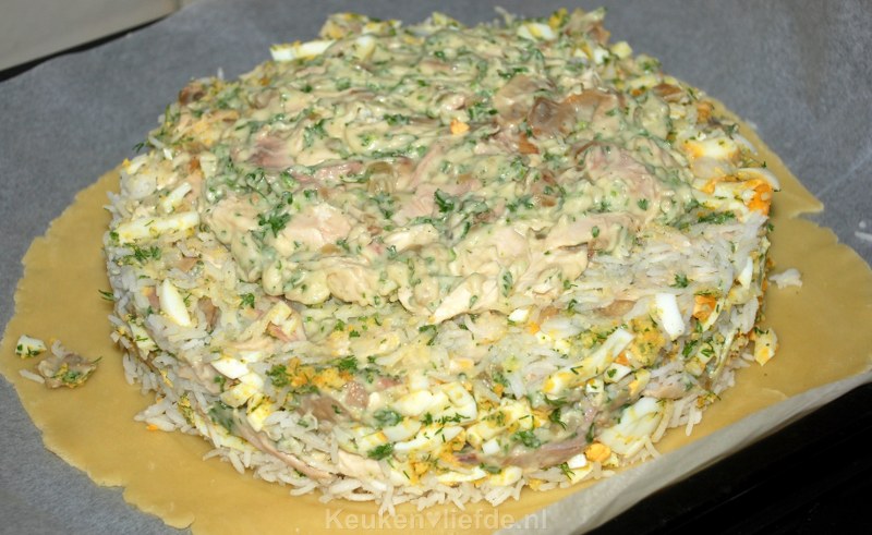 Leg de ronde lap op het bakblik en zet hier de rand van een ronde springvorm bovenop (ca. 28 cm ø). Rol de rest van het deeg uit tot een grote ronde lap van ca. 45 cm ø. Verdeel de rijst, ei en kippenragout er in lagen overheen en druk goed aan.