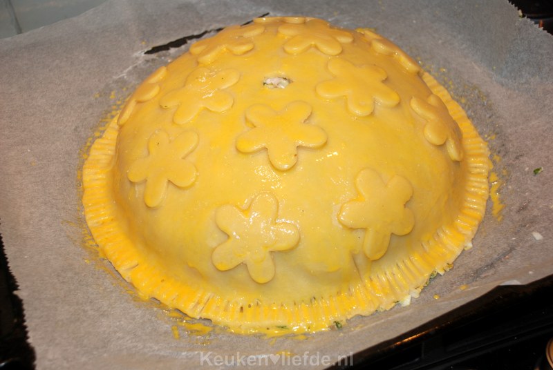 Houd een rand van 1 cm aan en snijd de rest van het deeg rondom af. Druk de randen op elkaar met een vork. Snijd uit de bovenkant van de taart een klein rondje uit het deeg, zodat de stoom kan ontsnappen. Rol het afgesneden deeg opnieuw uit tot een ronde lap en steek hier met een vormpje bloemetjes uit. Bestrijk de bloemen met eiwit en plak ze op de taart. Bestrijk nu de hele taart met de eidooier.
