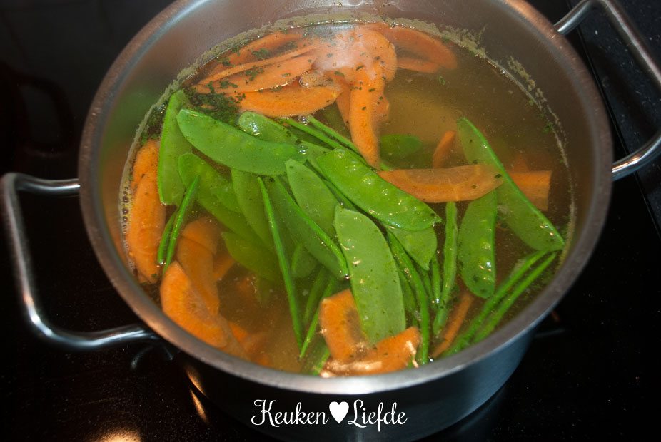 Vul de kookpan met 1,5 liter water, voeg de bouillontablet toe en breng aan de kook. Voeg de wortel toe en kook 2 minuten. Voeg de peulen toe en kook nog eens 1,5 minuut. Giet de groenten af en vang 750 ml van het kookvocht op. Spoel de groenten af met koud water.