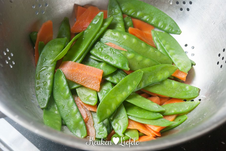 - 100 g wortel, geschrapt of geschild en in evengrote dungesneden plakjes als de peulen