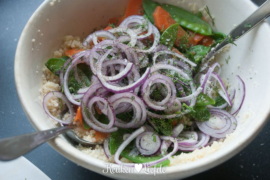 Doe de couscous in een diepe kom of schaal en overgiet met het opgevangen kookvocht, zoveel totdat de couscous nét iets onder staat (je hoeft dus niet al het vocht te gebruiken). Dek af met een bord en laat circa 8 minuten staan. Roer de couscous los met een vork en meng de groenten, ui, dille en tonijn erdoor.