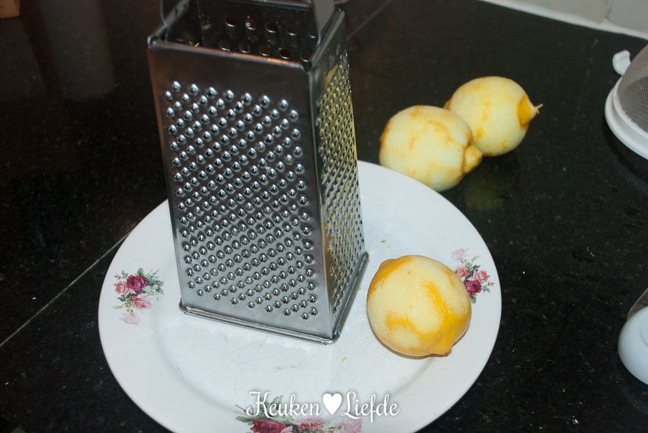 Rasp de schil van de citroenen (alleen het gele gedeelte, het witte eronder is bitter) en pers het sap uit.