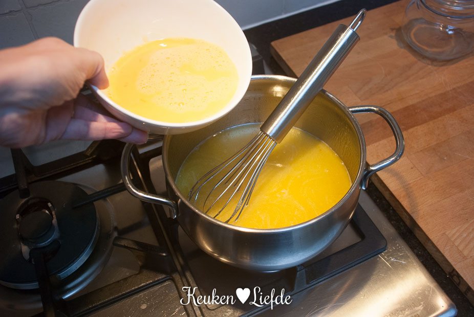 Voeg de boter en losgeklopte eieren toe en blijf met een garde roeren, totdat het mengsel begint in te dikken. Dit kan best even duren.