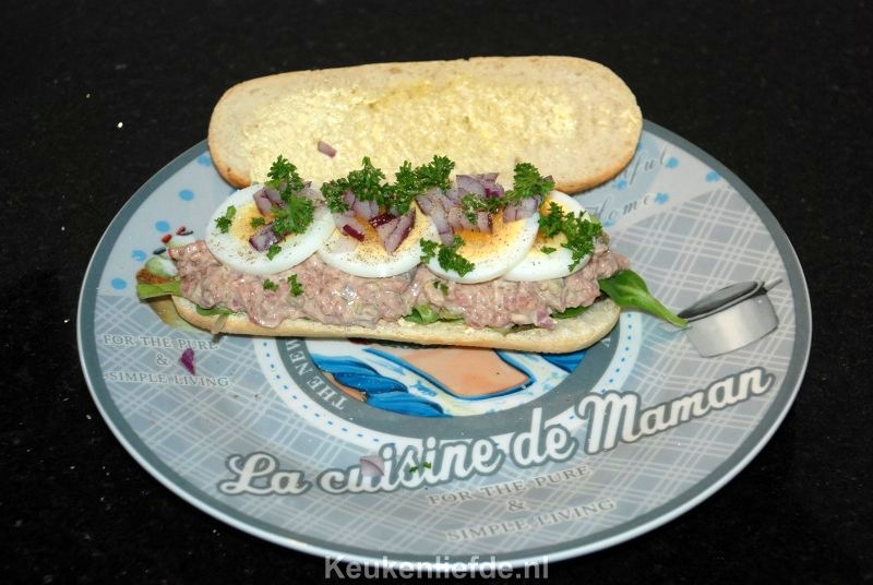 Beleg een lekker vers knapperig broodje met een paar slablaadjes, een royale laag filet americain, plakjes hardgekookt ei, een fijn gesnipperde rode ui en wat blaadjes verse peterselie.