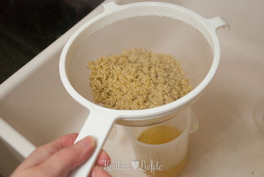 Kook de quinoa in circa twaalf minuten gaar. Giet de quinoa af in een zeef en vang circa 100 ml van het kookvocht op.