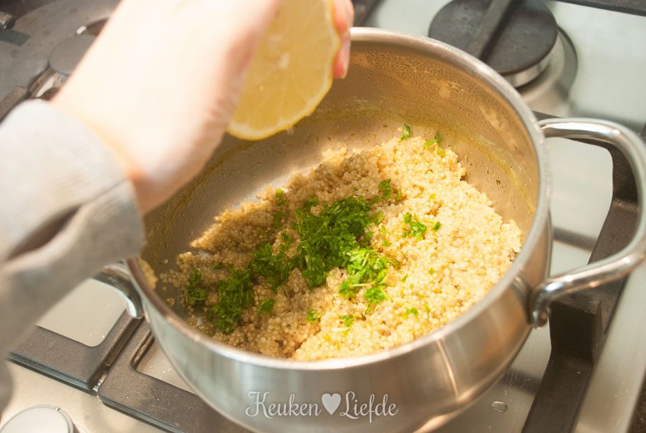 Doe de uitgelekte quinoa terug in de pan en breng op smaak met wat olijfolie, citroensap en koriander.