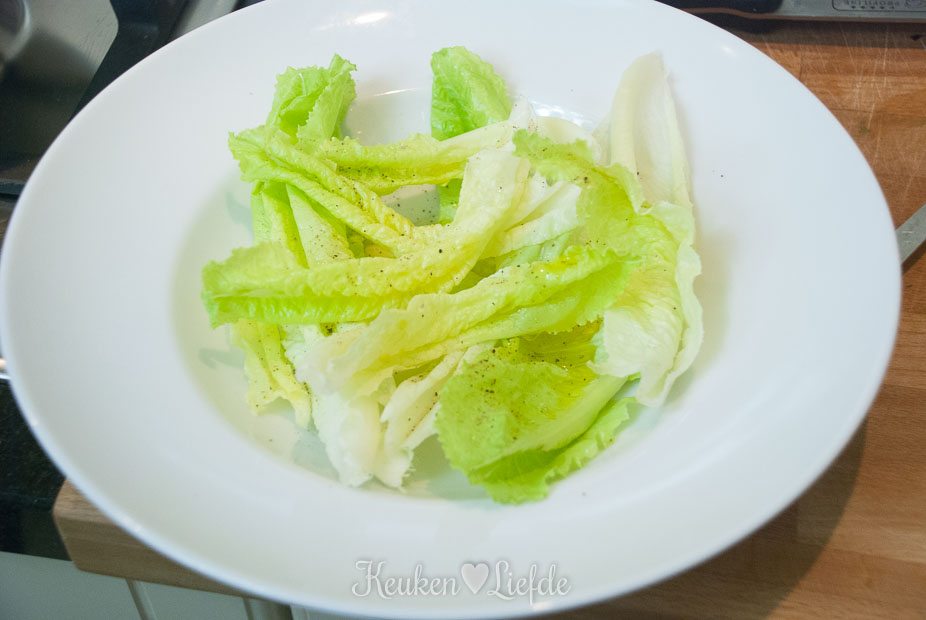 - 1 klein kropje little gem, of bindsla (Romeinse sla), blaadjes losgehaald, gewassen en drooggedept