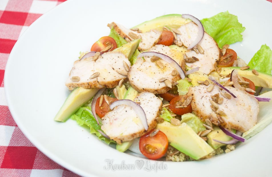 Trancheer de kip (in schuine plakken snijden) en maak de borden op. Leg op elk bord wat slablaadjes, gevolgd door de quinoa, tomaat, rode ui, avocado, kip en zonnebloempitten. Besprenkel de salade indien wenselijk nog met het opgevangen kookvocht, olijfolie of citroensap.