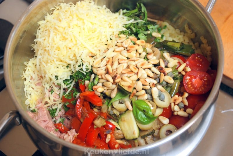 Doe de macaroni terug in de pan en roer alle overige ingrediënten erdoor.
