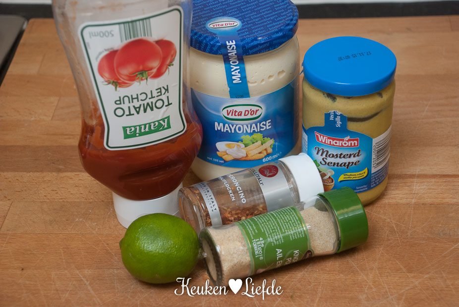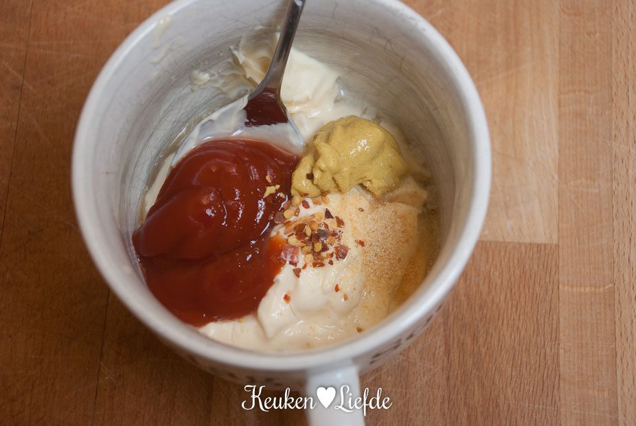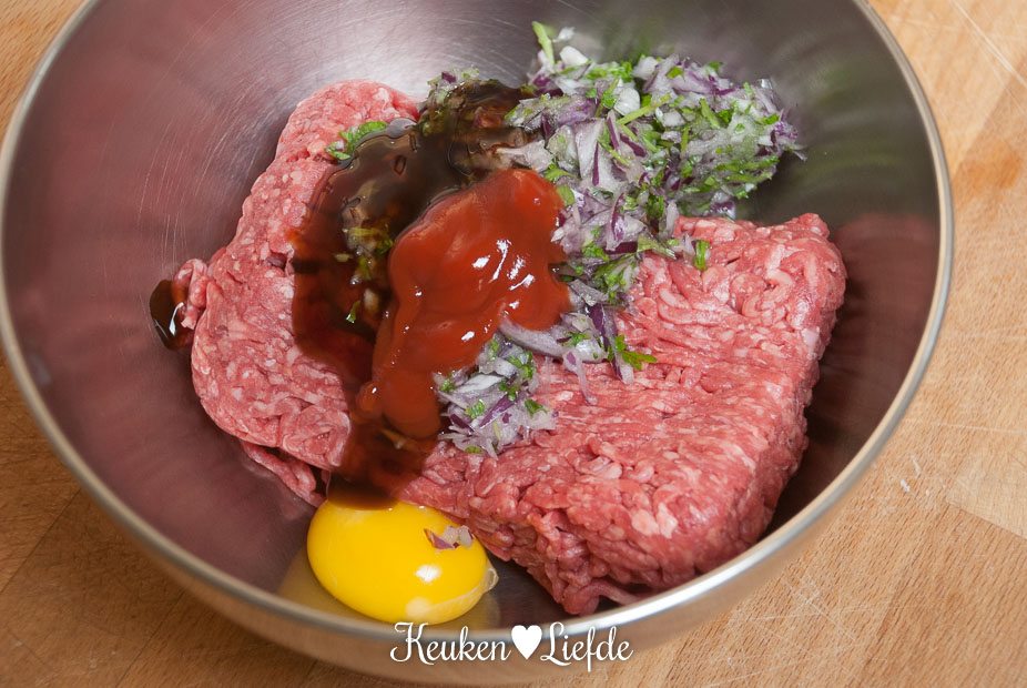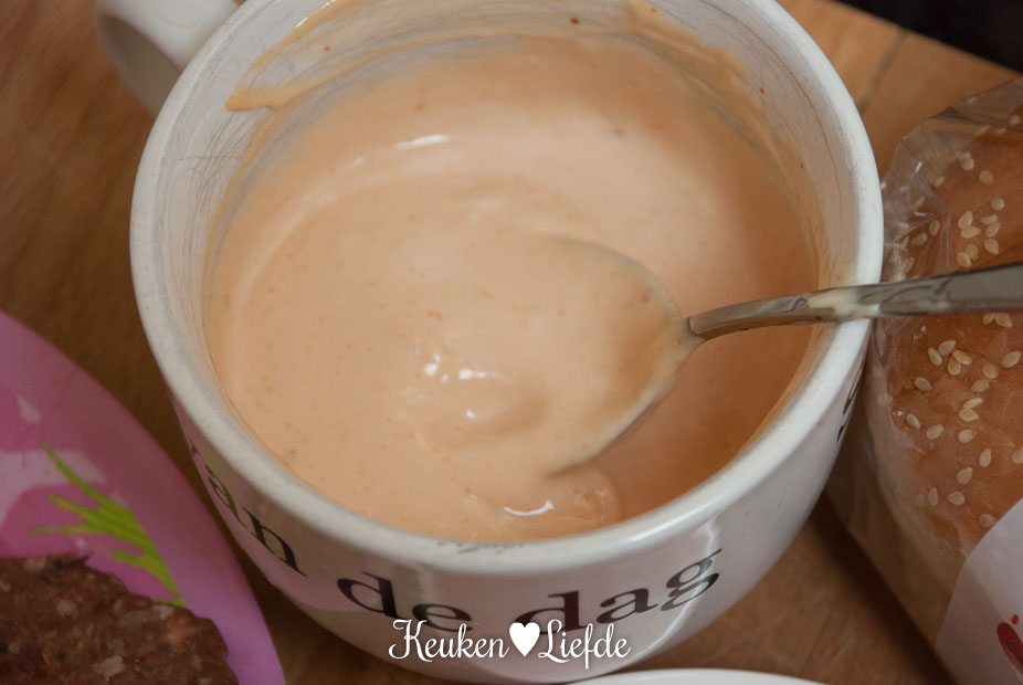 Roer de de ingrediënten voor de hamburgersaus door elkaar en zet weg.