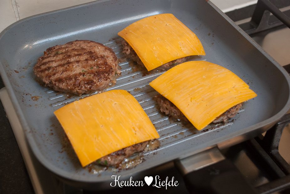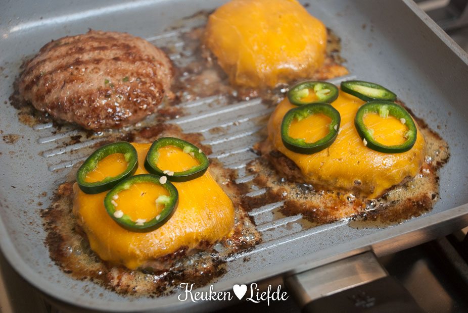 Grill de hamburgers circa 3 minuten aan één kant, draai ze om en beleg met een plakje cheddar en jalapeño. Grill nog 3 circa minuten verder, of totdat de kaas gesmolten is en de burgers gaar zijn.