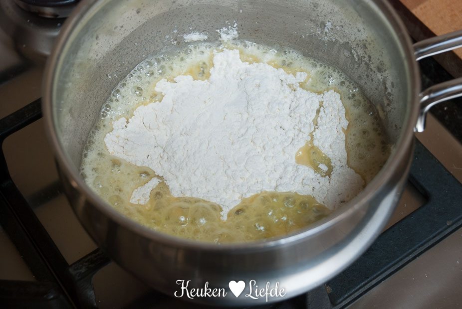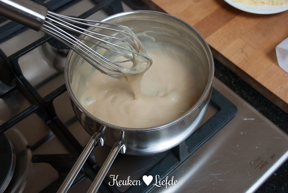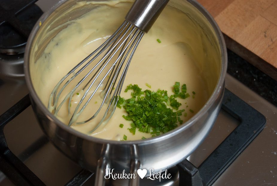 Smelt de boter en voeg de bloem toe. Laat de bloem al roerend garen, maar niet bruin worden. Dit duurt ongeveer een minuut. Giet langzaam de bouillon erbij en blijf roeren totdat je een dikke ragout hebt. Voeg de kaas, mosterd en bieslook toe en breng op smaak met peper.