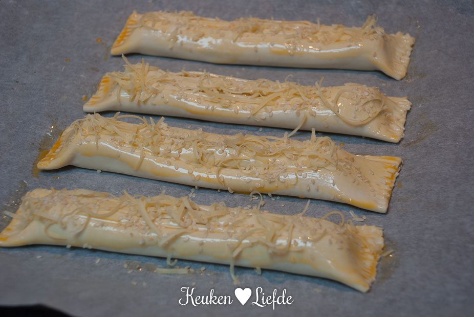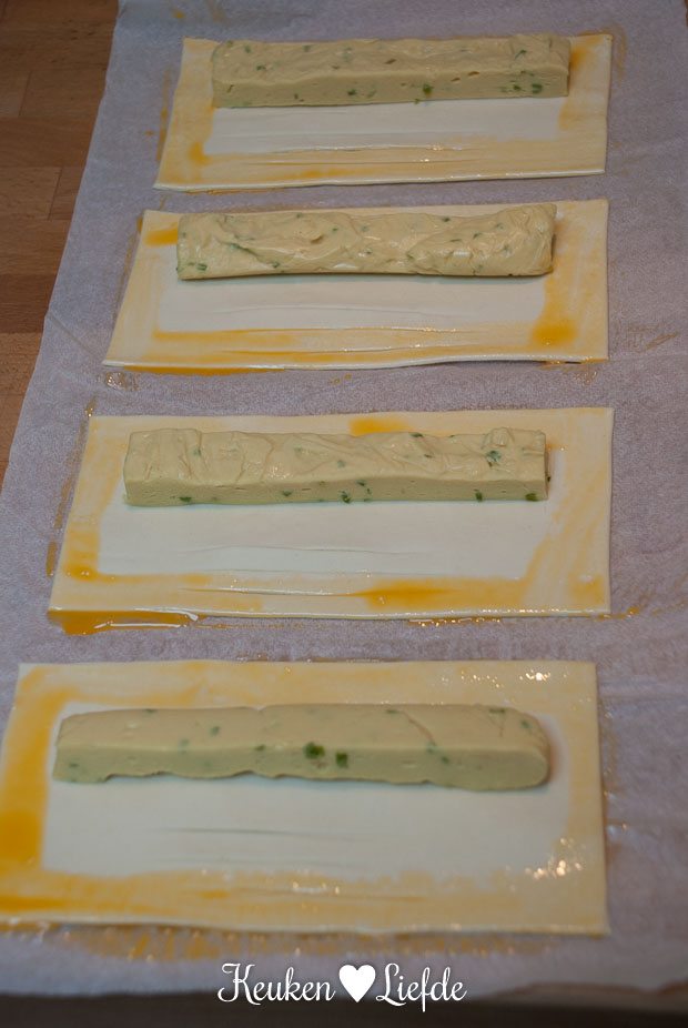 Laat de ragout afkoelen en doe in een spuitzak. Spuit de ragout in de lengte op de bladerdeegrechthoeken. Hou de randen vrij.