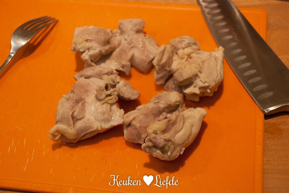Kook de kippendijen gaar in het groentevocht. Schep uit de pan en hak in kleine stukjes. (Het kookvocht heb je niet meer nodig, maar kun je gebruiken voor bijvoorbeeld kippensoep.)