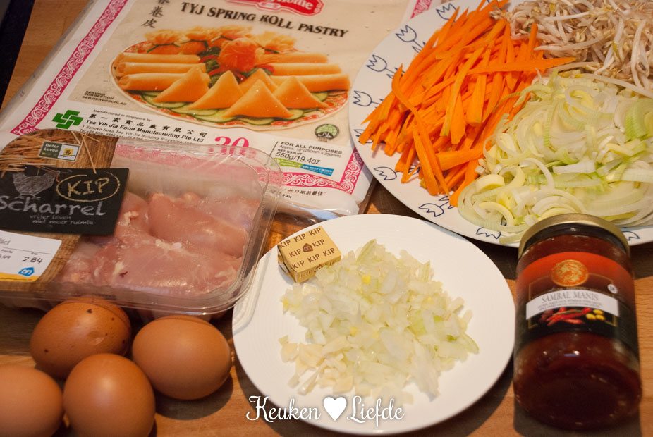 - 1 pak loempiavellen (spring roll pastry, verkrijgbaar bij toko, of AH)
