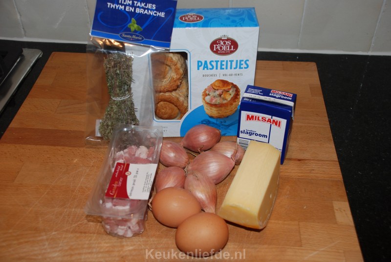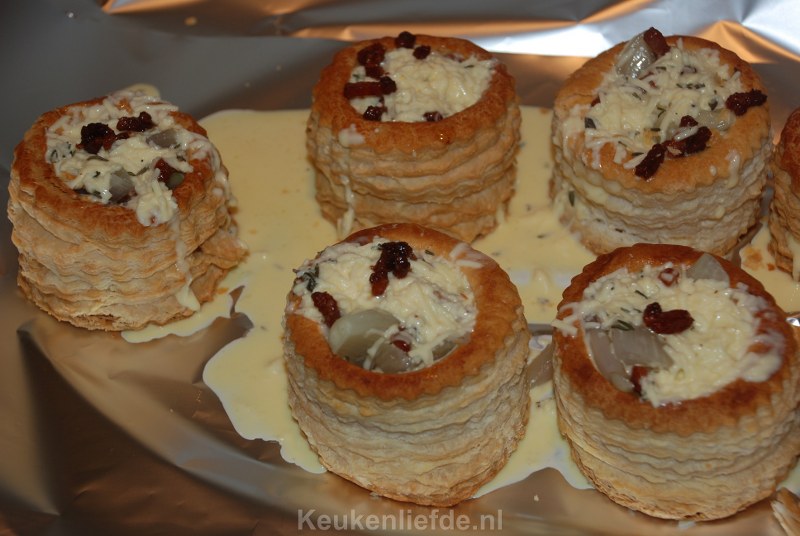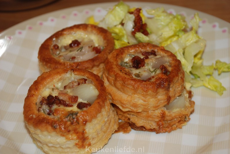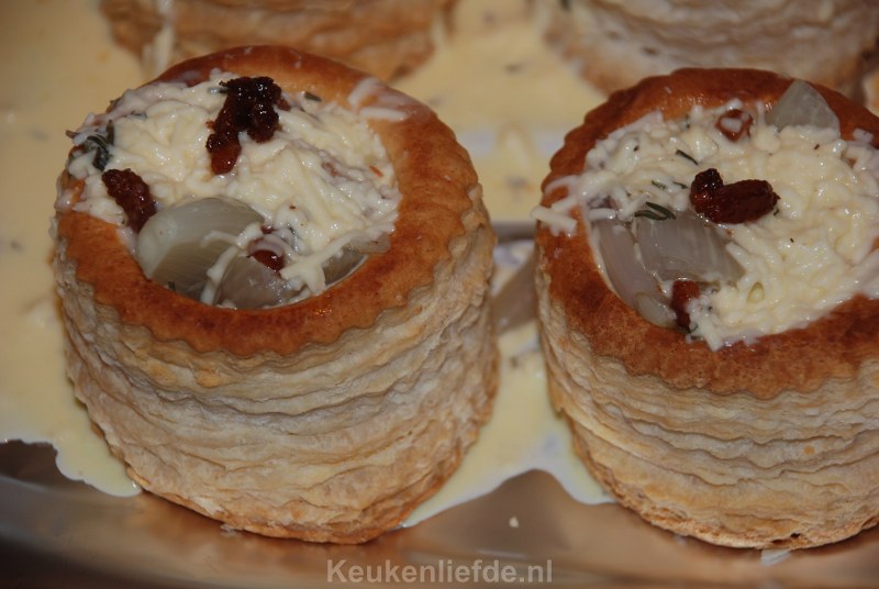 Dit is echt een superlekker voorgerechtje, kleine pasteibakjes gevuld met een ei-roommengsel. Wij hebben dit al vaak gemaakt voor onszelf en voor gasten en het is iedere keer weer een succes.
