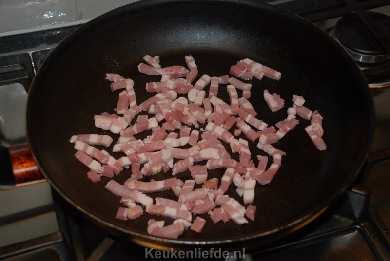 Bak in een droge koekenpan met antiaanbaklaag de spekjes knapperig en laat ze iets afkoelen.