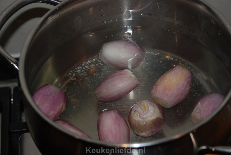 Verwarm de oven voor op 180 graden. Pel de sjalotten en kook ze 8-10 minuten in een bodempje water met zout.